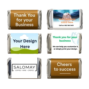 Sweeten your celebration with our custom mini candy bar wrappers! Each one is beautifully wrapped around genuine Hershey’s Miniatures — a delicious mix of Milk Chocolate, Special Dark, Krackel, and Mr. Goodbar. Perfect for weddings, birthdays, baby showers, and corporate events. Designed, printed, and wrapped with care to make every bite unforgettable. Our mini candy bar are custom-designed with your logo, slogan, or colors — perfect for trade shows, grand openings, or client gifts.